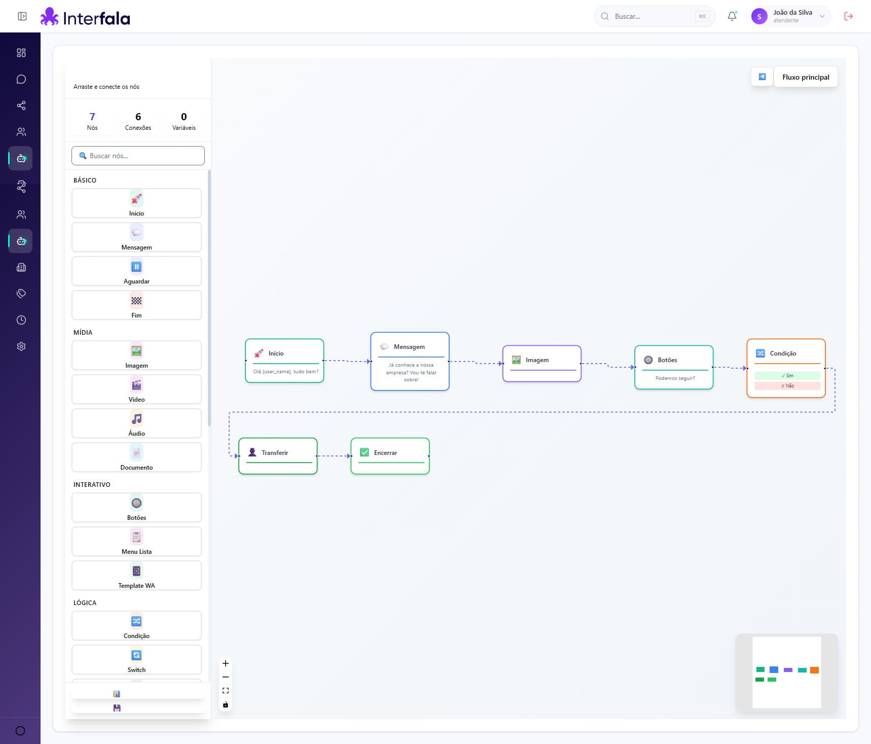 Crie jornadas de atendimento automatizadas sem código. Arraste e solte para construir fluxos inteligentes que respondem, direcionam e encantam seus clientes.